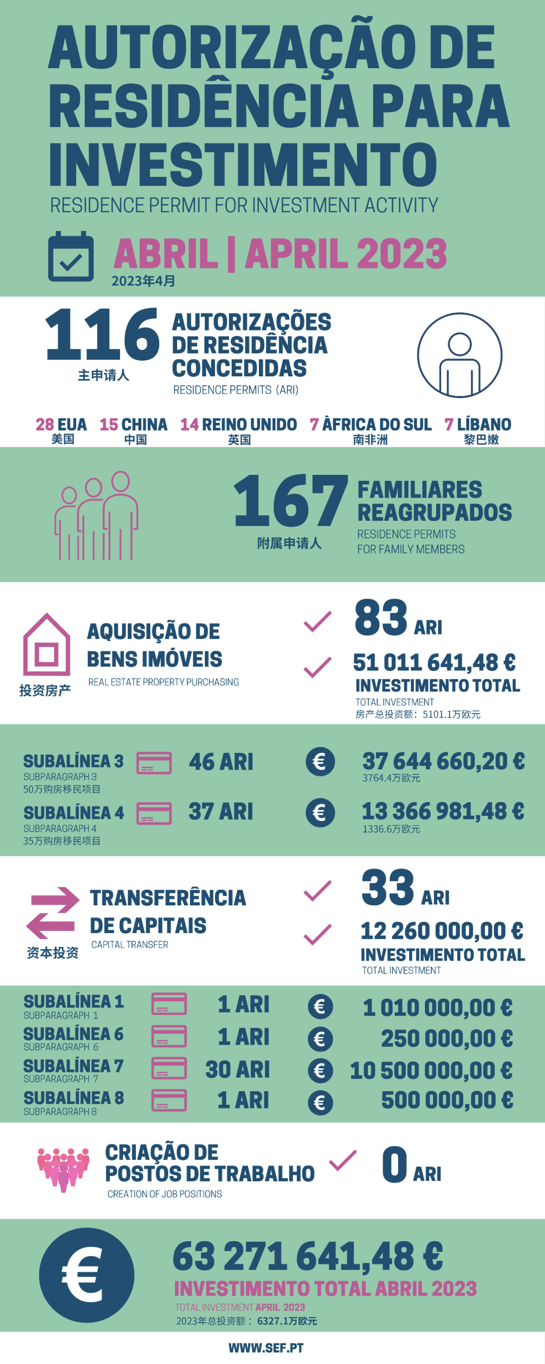 近日,葡萄牙移民局(SEF)正式發布了4月的黃金簽證最新統計數據。4月共有116位主申請人和167位附屬申請人獲批葡萄牙黃金簽證。獲批總人數為283人,總投資額約6327萬歐元。