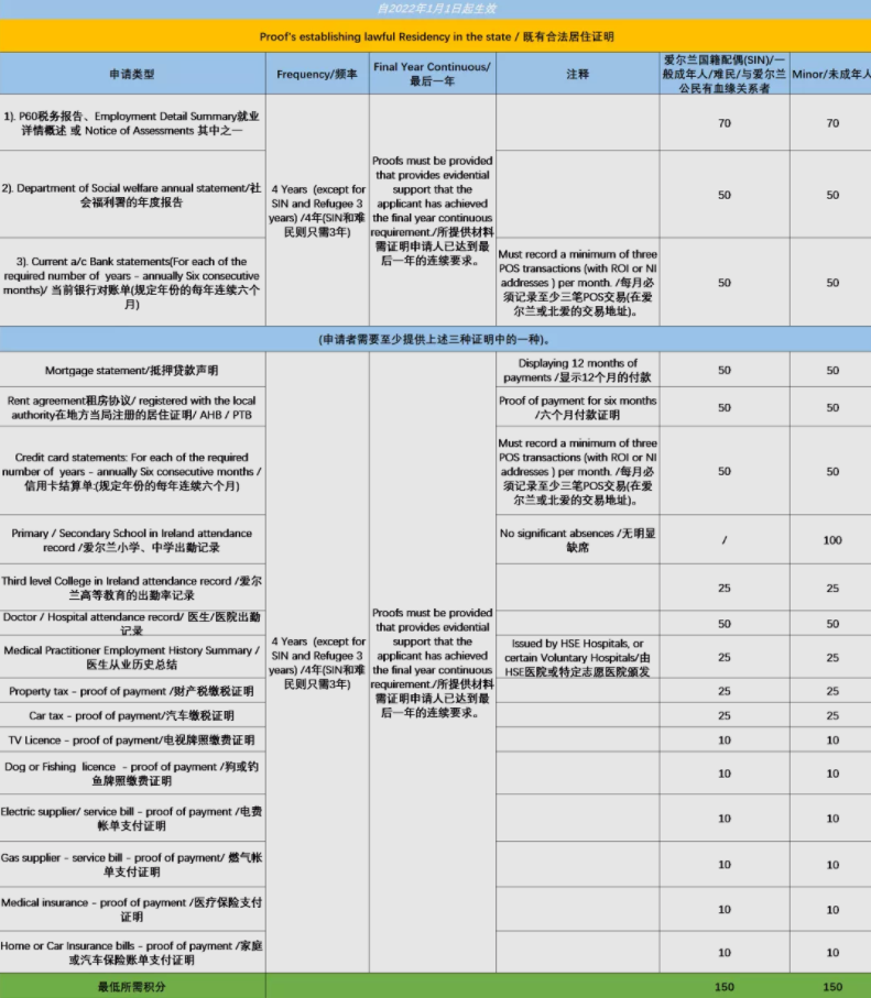 積分制的引入,使申請人更加明確需提供哪些文件證明,以成功獲取公民身份。根據(jù)愛爾蘭移民局官網(wǎng)公布的積分細(xì)則,申請者需要在身份認(rèn)證(Identity)和居住證明(Residency)兩方面均滿足每年150分的積分要求。