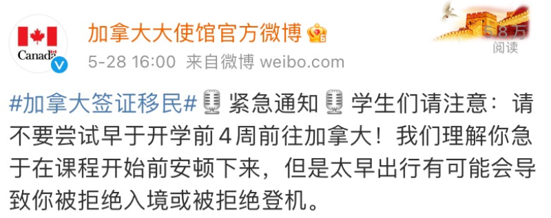 加拿大駐華使館緊急發(fā)布最新提醒:留學(xué)生請勿早于開學(xué)前四周抵達(dá)加拿大,極有可能被海關(guān)拒絕入境或被拒絕登機!如果9月7日開學(xué),那么往前回溯四周28天,則不要預(yù)定早于8月10日抵達(dá)加拿大的航班。