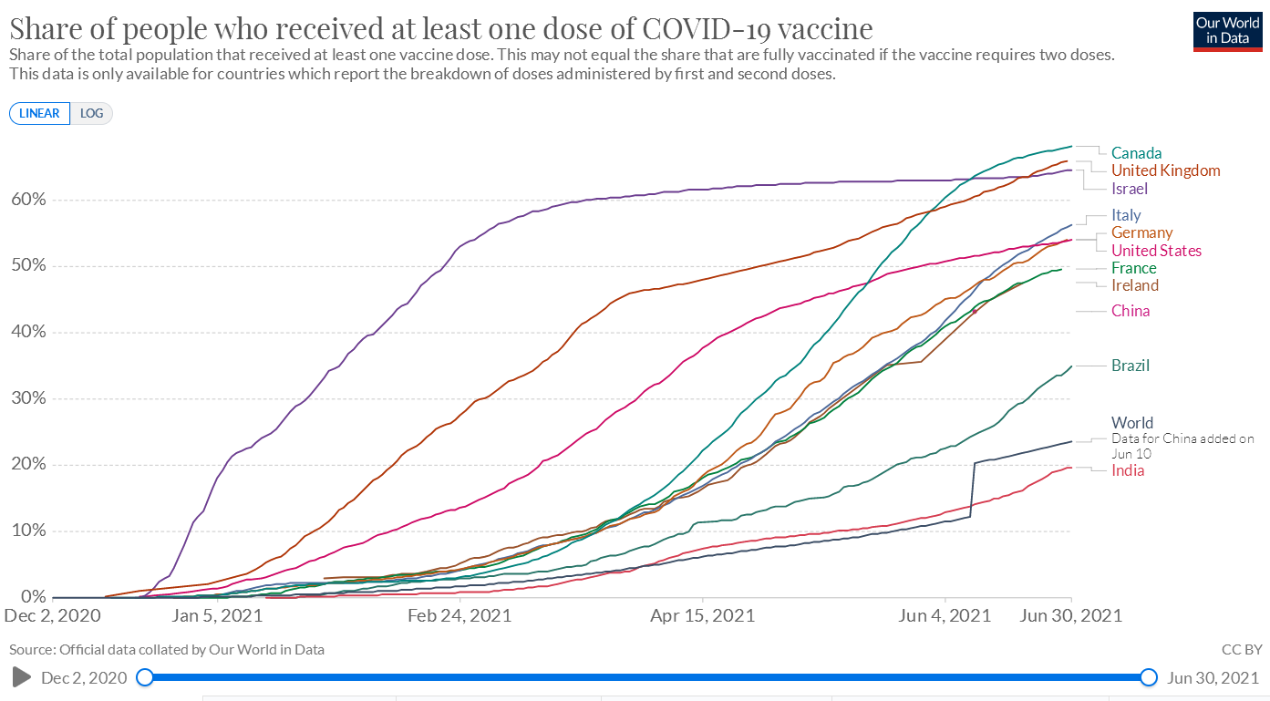 今年年初,加拿大疫苗接種速度還備受詬病,而4月以來(lái),加拿大疫苗接種速度仿佛突然蘇醒一般,飛速提升,一舉逆襲英國(guó)、美國(guó)、以色列,穩(wěn)坐世界第一!