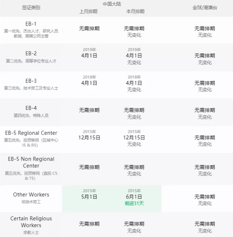 ·EB-3技術(shù)類無(wú)變化,非技術(shù)類前進(jìn)31天至2015年6月1日;