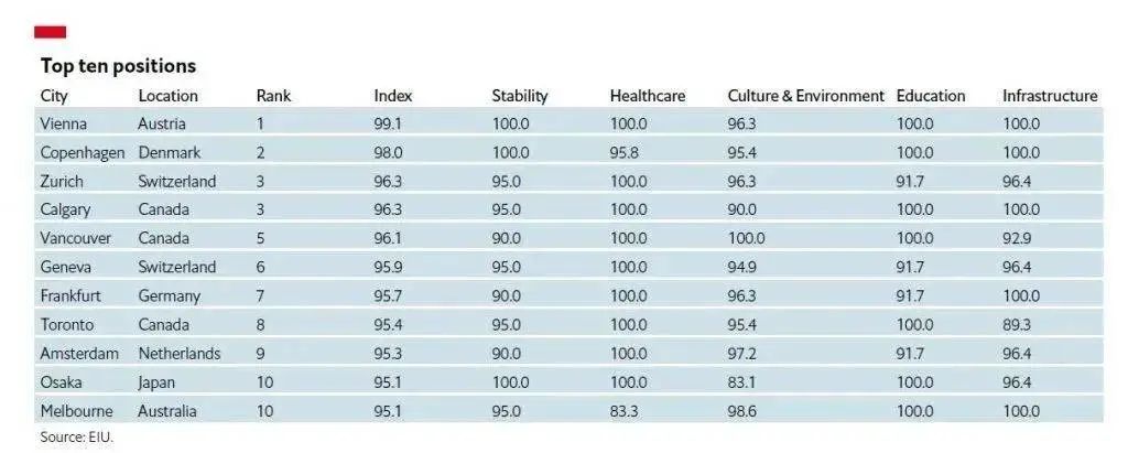 近日,英國(guó)經(jīng)濟(jì)學(xué)人智庫(kù)發(fā)布了“2022年全球最宜居城市”排行榜。