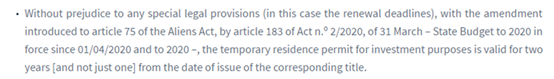 今年4月,葡萄牙頒布了第2/2020號法令,其中的第183條對移民法里居留卡的有效期進行了修改,將黃金居留卡的首次有效期由1年調整為2年。盡管法案已經生效,但卻缺乏法案的具體執(zhí)行細節(jié)。